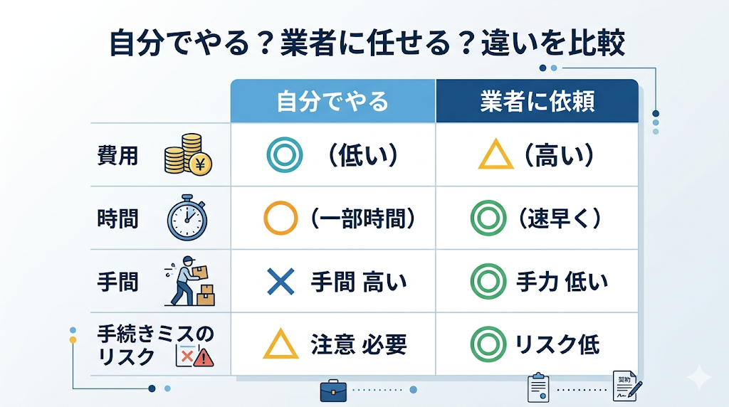 一方、業者に依頼すれば費用はかかりますが、書類不備のリスクを減らし、手続きをスムーズに進められます。
